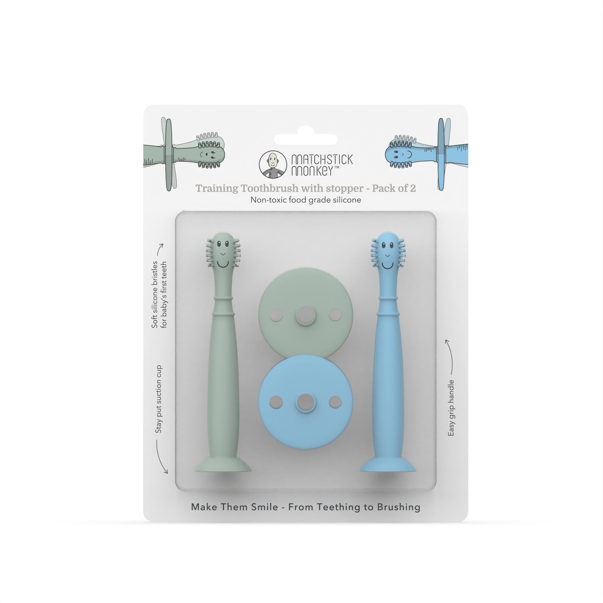 Matchstick Monkey æfingatannburstanir eru frábært millistig á milli nagvöru og tannbursta. Eru úr hágæða sílikoni eins og vinsælu nagaparnir. Barnið getur æft sig sjálft að bursta tennur og einnig er gott að naga vörurnar. Koma tveir saman í pakka.