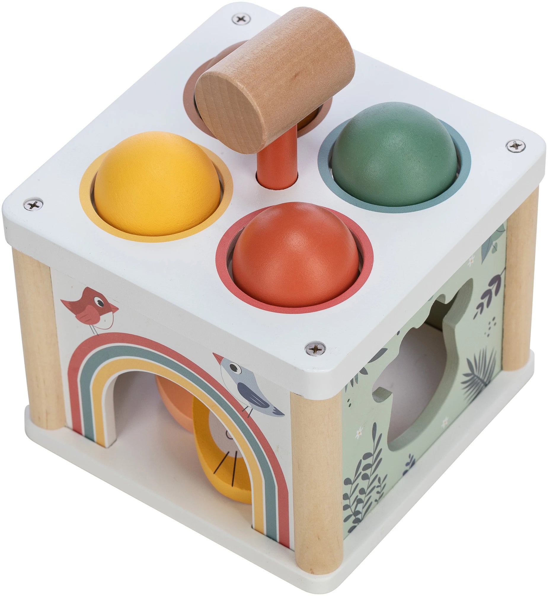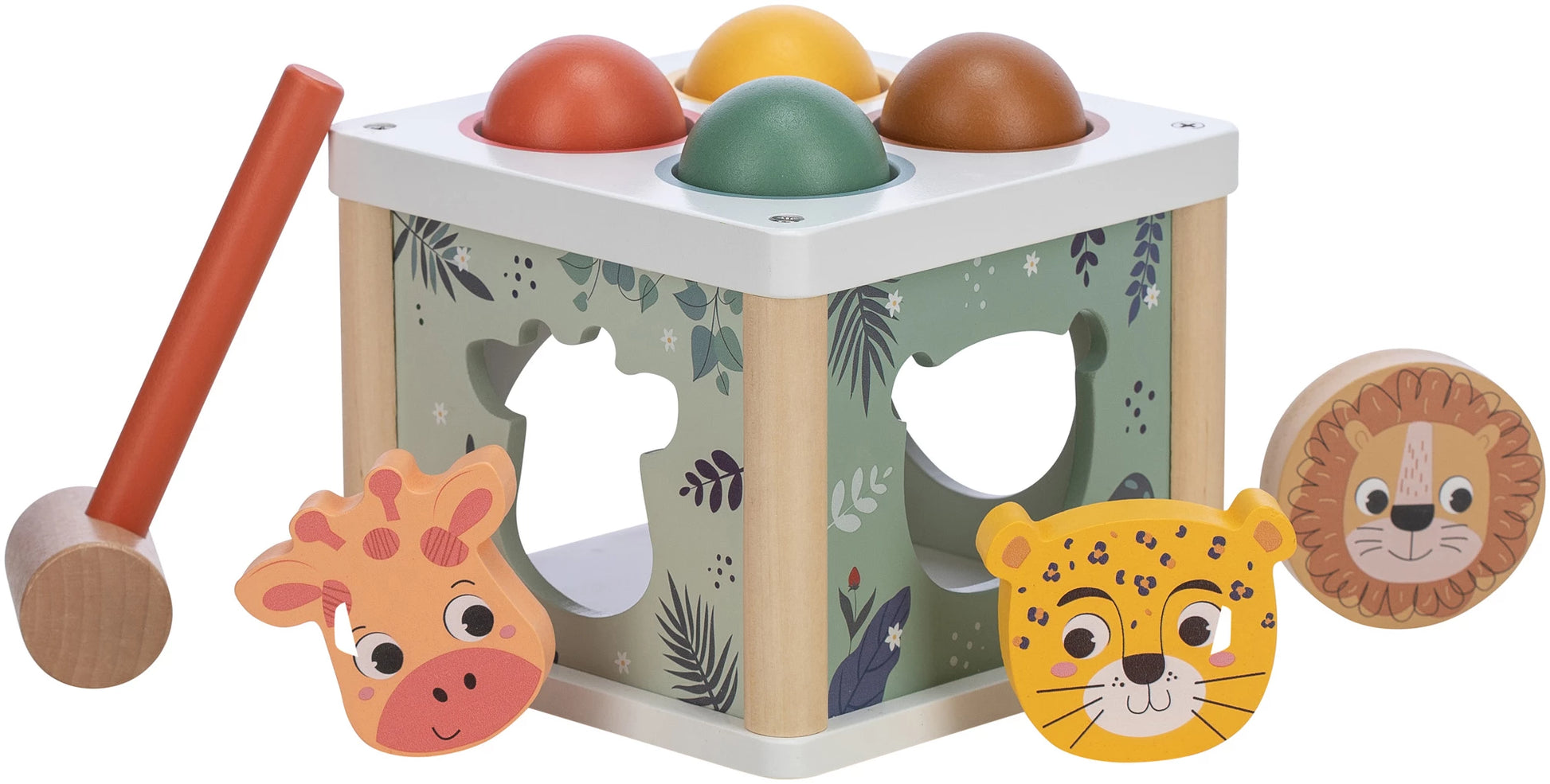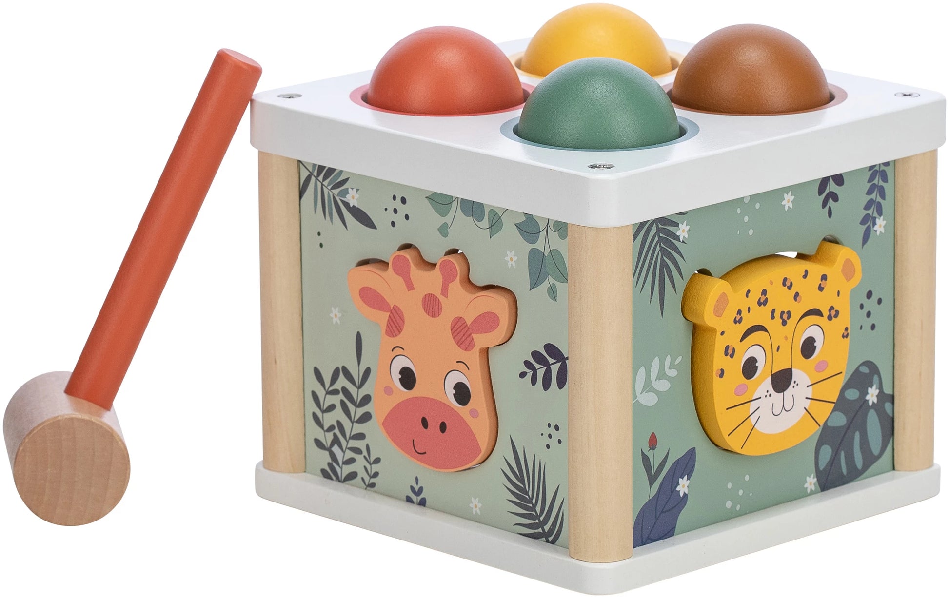 Fallegur viðarkassi með þroskandi verkefnum á öllum hliðum. Notið hamarinn til að slá kúlurnar í boxið og púslið dýrunum inn. Frábær til að æfa vitsmuna og hreyfiþroska.