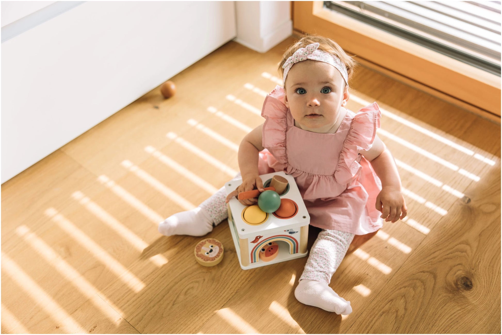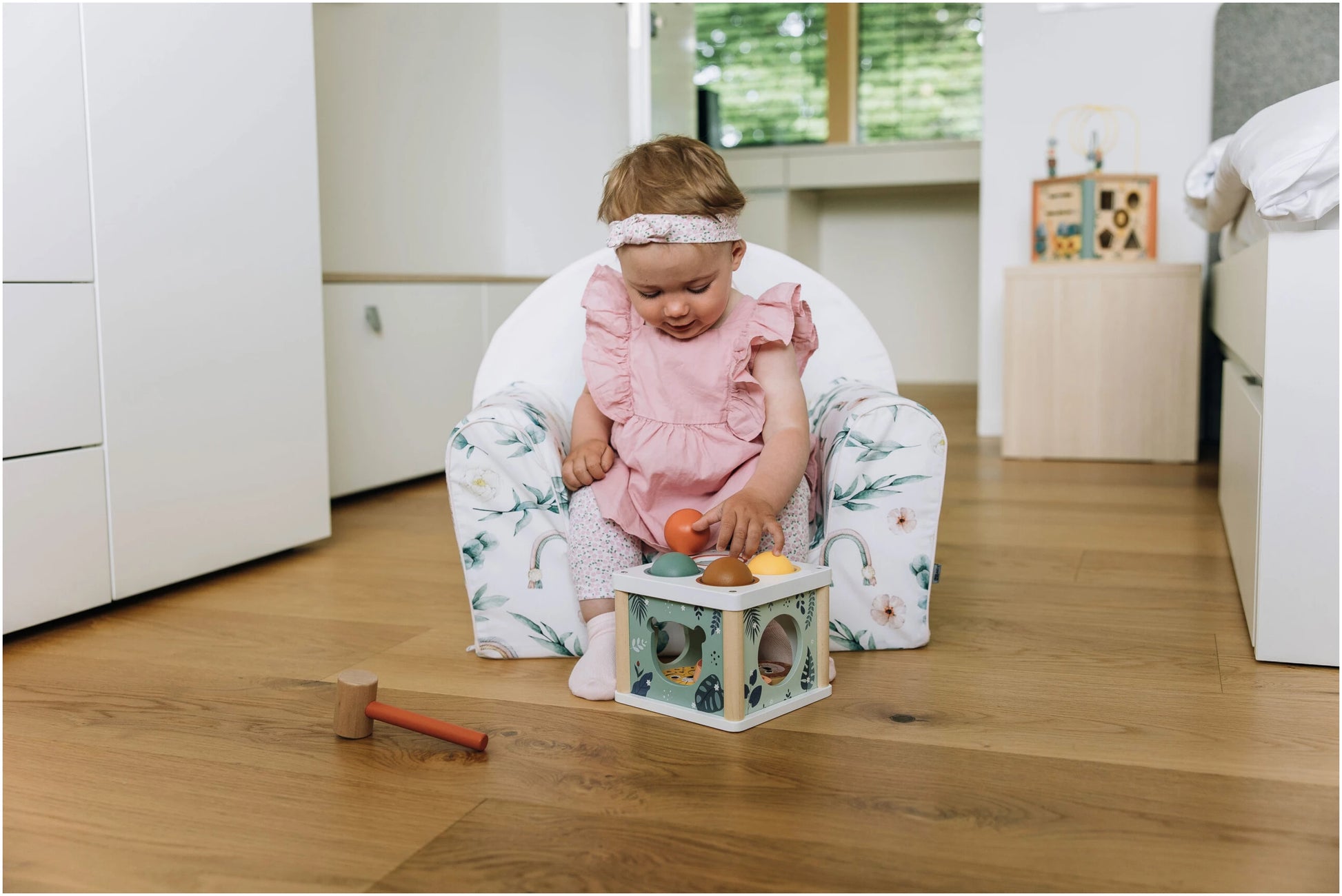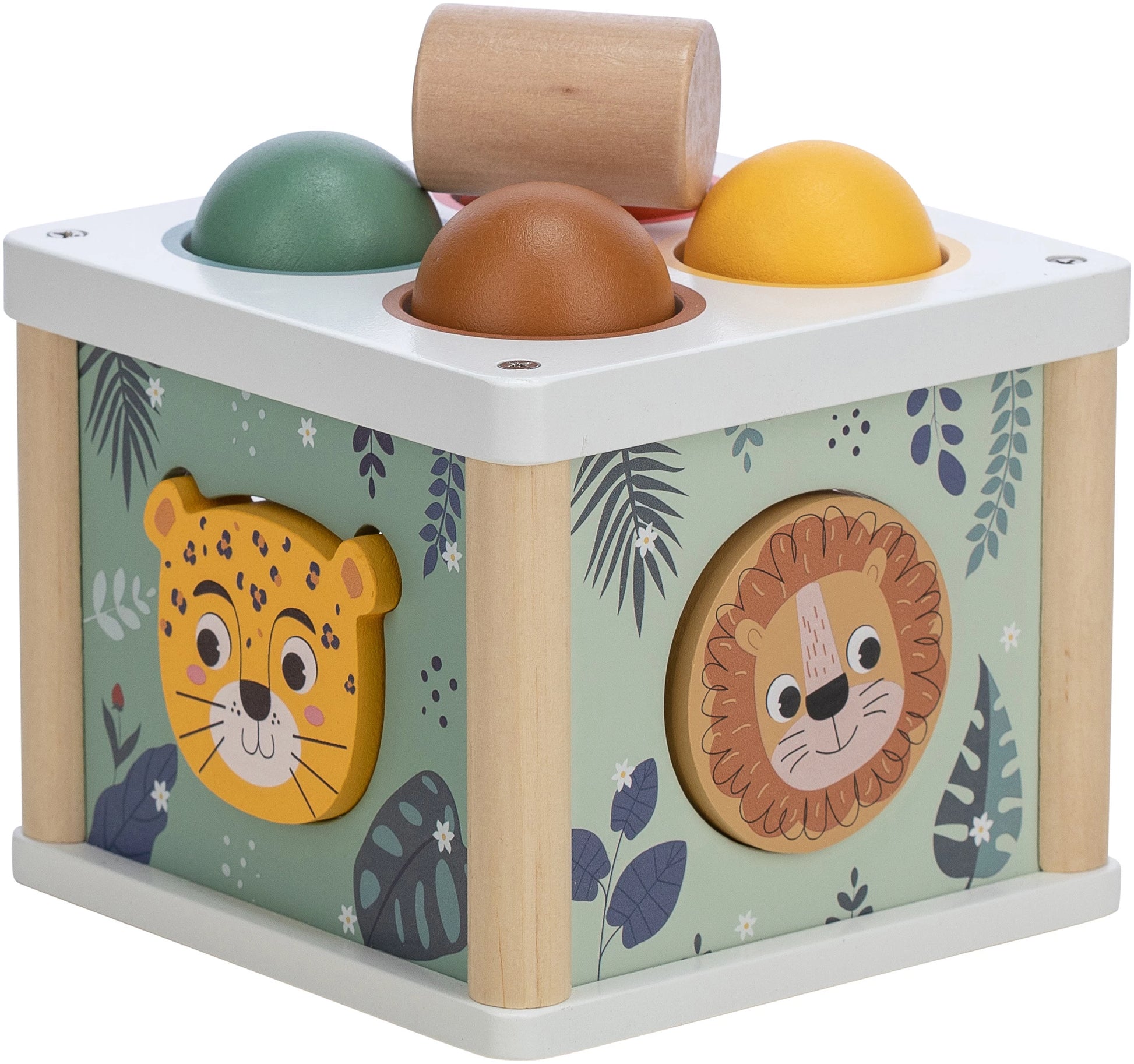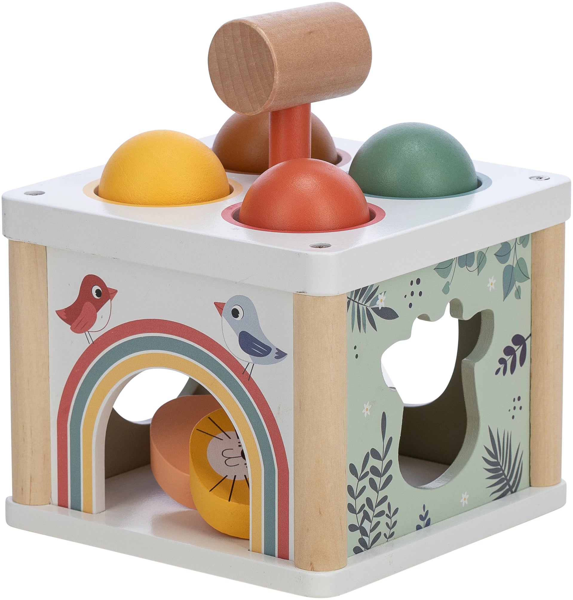 Fallegur viðarkassi með þroskandi verkefnum á öllum hliðum. Notið hamarinn til að slá kúlurnar í boxið og púslið dýrunum inn. Frábær til að æfa vitsmuna og hreyfiþroska.