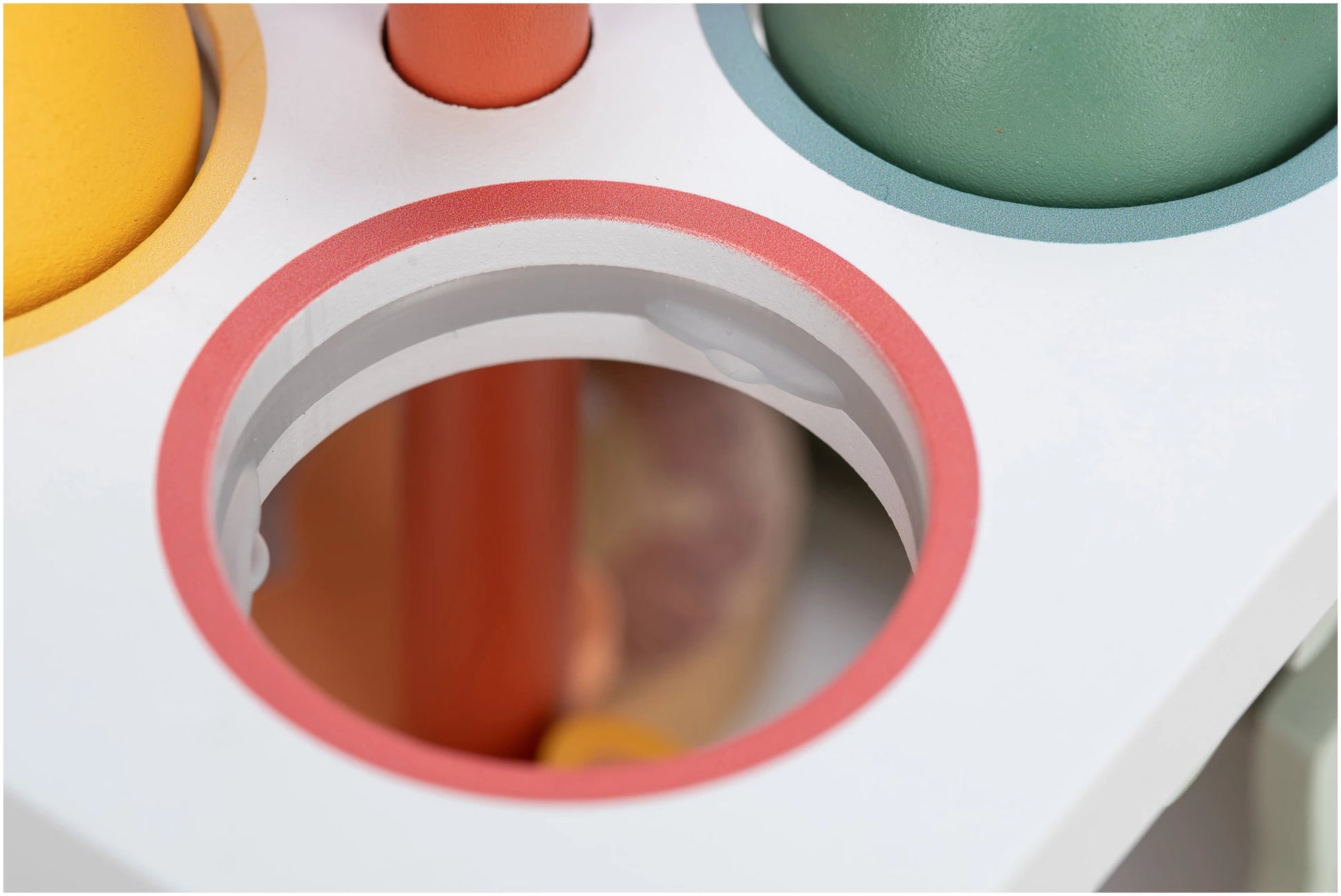 Use the hammer to hit the balls inside the house. The house has included characters that the child can push through the openings. An excellent game for training fine motor skills and hand-eye coordination. The toy is suitable for children from 12 months. Dimension: 15 x 15 x 12 cm.